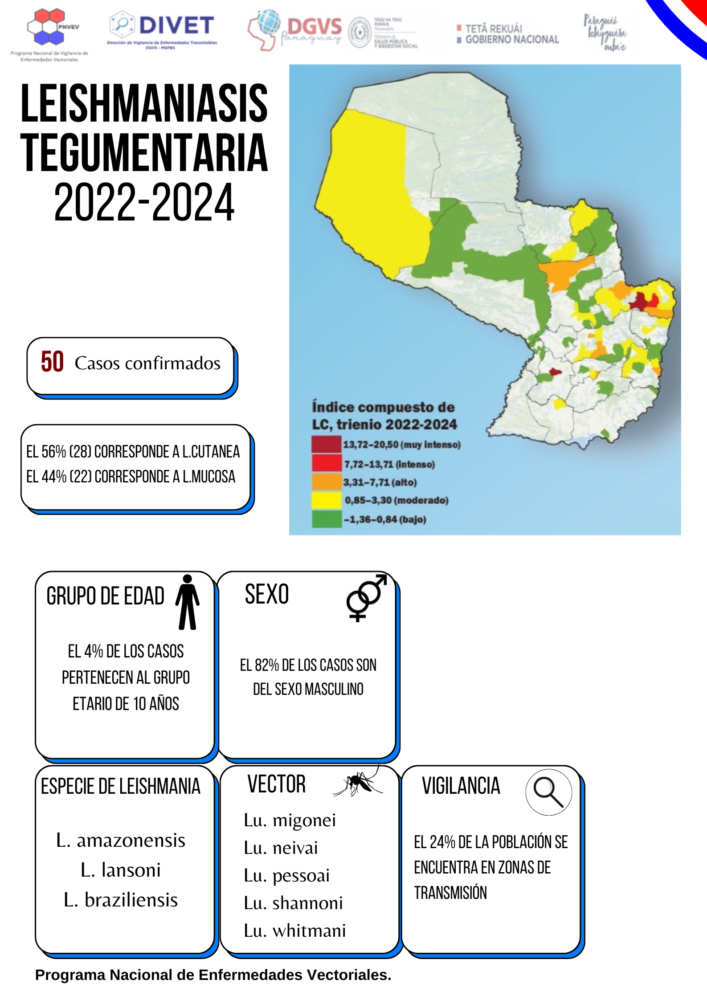 Se presenta mayormente en personas del sexo masculino, afectando en su mayoría adultos jóvenes, siendo las áreas de mayor riesgo para la transmisión los departamentos de Amambay, Boquerón, Canindeyú, Concepción y San Pedro.