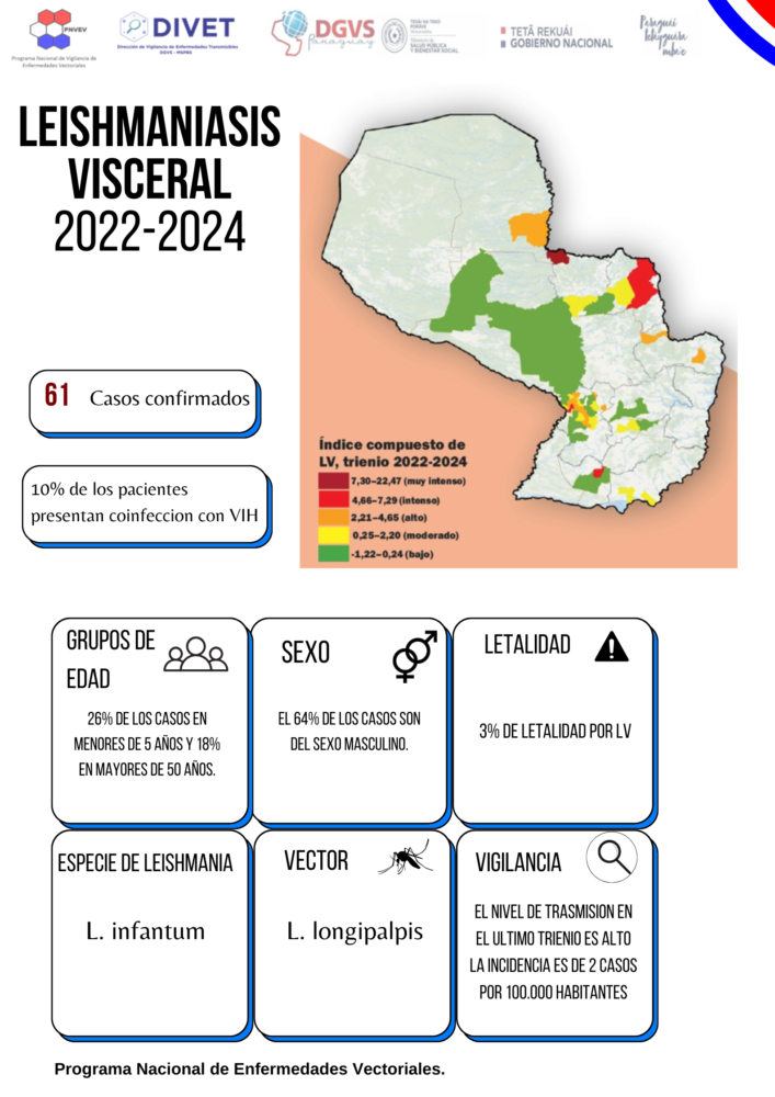 Más del 90% de los casos provienen del distrito de Asunción y de los Departamentos Central, Paraguarí y Cordillera, en donde convergen una alta proporción de perros infectados y flebótomos vectores, además del crecimiento urbano desordenado de la población.
