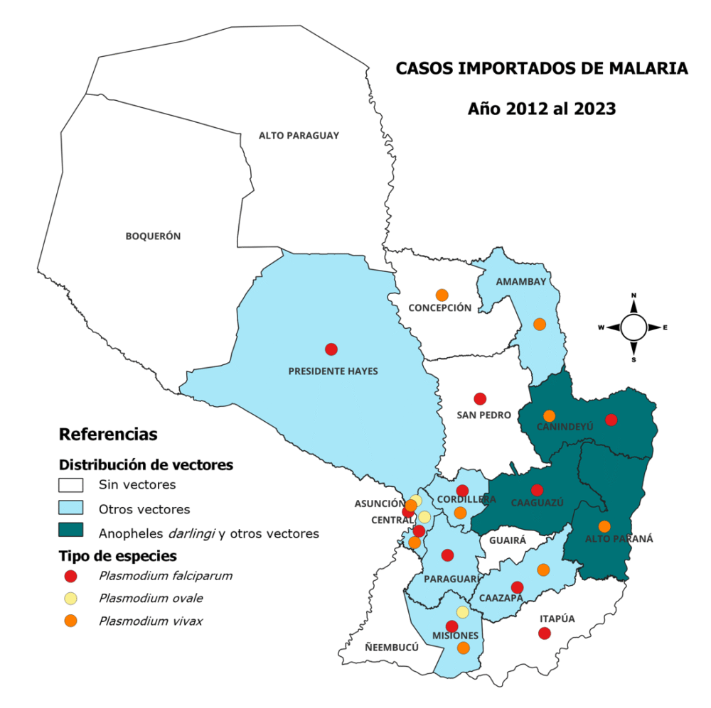 El último caso autóctono fue notificado en el año 2011. Actualmente Paraguay se encuentra en la etapa de “prevención de la reintroducción o del restablecimiento de la malaria”, por lo cual es importante mantener la vigilancia y la capacidad de diagnóstico en todas las regiones del país, teniendo en cuenta la amplia distribución del vector, la detección de casos importados, y el alto flujo migratorio con países que aún cuentan con áreas de transmisión activa.