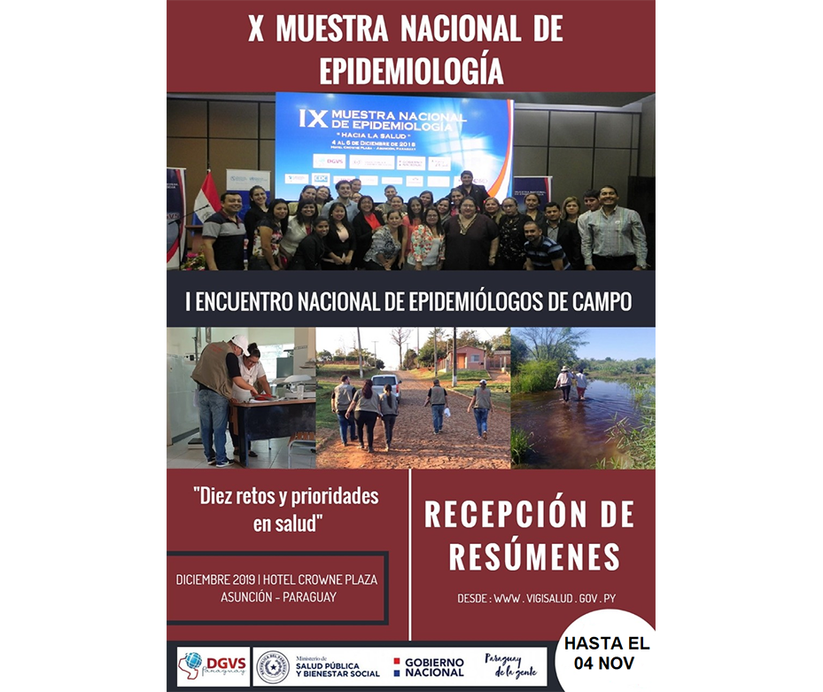 La Dirección General de Vigilancia de la Salud informa que, a partir de la fecha hasta el lunes 4 de noviembre -hasta la medianoche- se extiende el plazo para la presentación de resúmenes de investigación que serán expuestos durante la X Muestra Nacional de Epidemiología y I Encuentro de Epidemiólogos de Campo, a realizarse del 4 al 6 de diciembre, en el Hotel Crowne Plaza de Asunción.