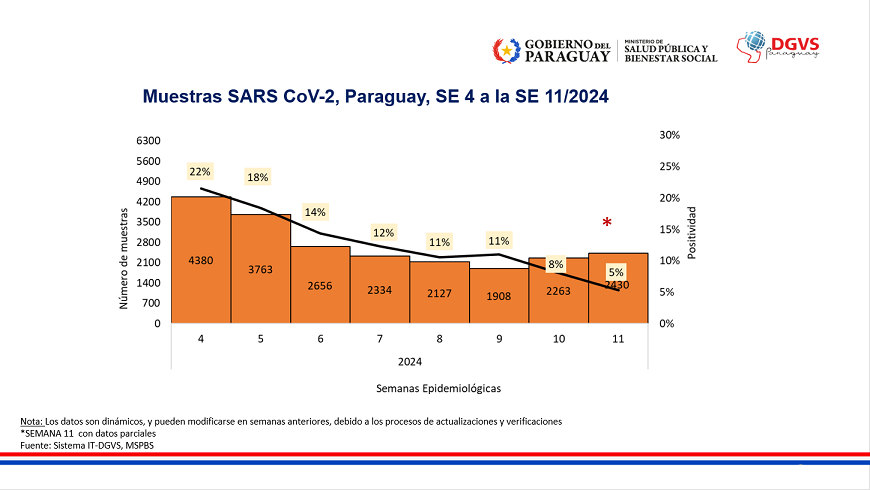 En lo que respecta a la positividad de contagios se registra una tasa de 5%, evidenciando un descenso con relación a semanas anteriores.