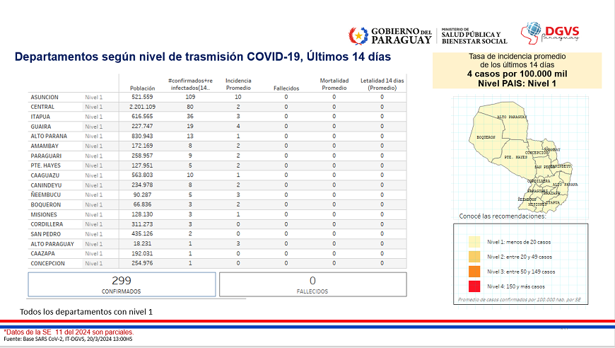 Hasta el momento se mantiene una baja transmisión comunitaria – Nivel 1, con una tasa de incidencia de 4 casos por 100.000 habitantes.