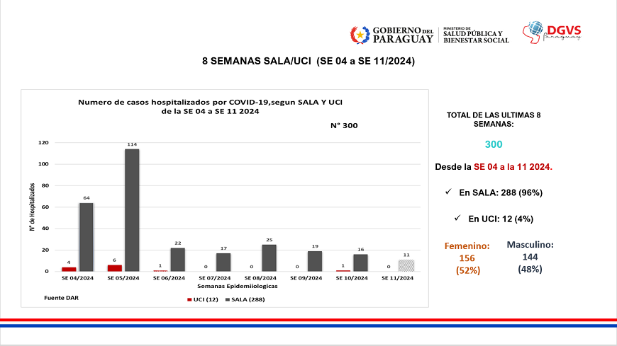 Con respecto a los datos de hospitalizados, en las últimas ocho semanas 300 personas fueron hospitalizadas a causa del COVID-19, de los cuales, 47 corresponde a las últimas tres semanas, uno de ellos ingresó a la unidad de cuidados intensivos. El mayor porcentaje de internaciones se registró principalmente en el grupo de 0 a 4 años, seguido de la franja de 80 años y más.
