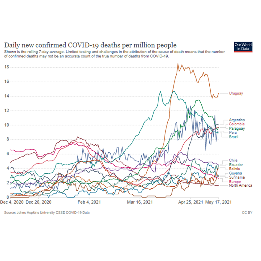 De acuerdo a lo que se constata en la plataforma Our World in Data, Paraguay reporta una tendencia favorable de descenso en cuanto a tasa de mortalidad especifica (promedio de muertes diarias por millón) posicionándose por debajo de Uruguay, Argentina y Colombia.  En contraste a la semana anterior, la plataforma Worldometers había catalogado al Paraguay como el segundo país con más muertes por millón de habitantes en los últimos siete días solo superado por Uruguay, sin embargo, se estima que el descenso actual que se observa en la mortalidad especifica en los últimos siete días, de -8%, posiciona a nuestro país en el sexto lugar a nivel mundial.