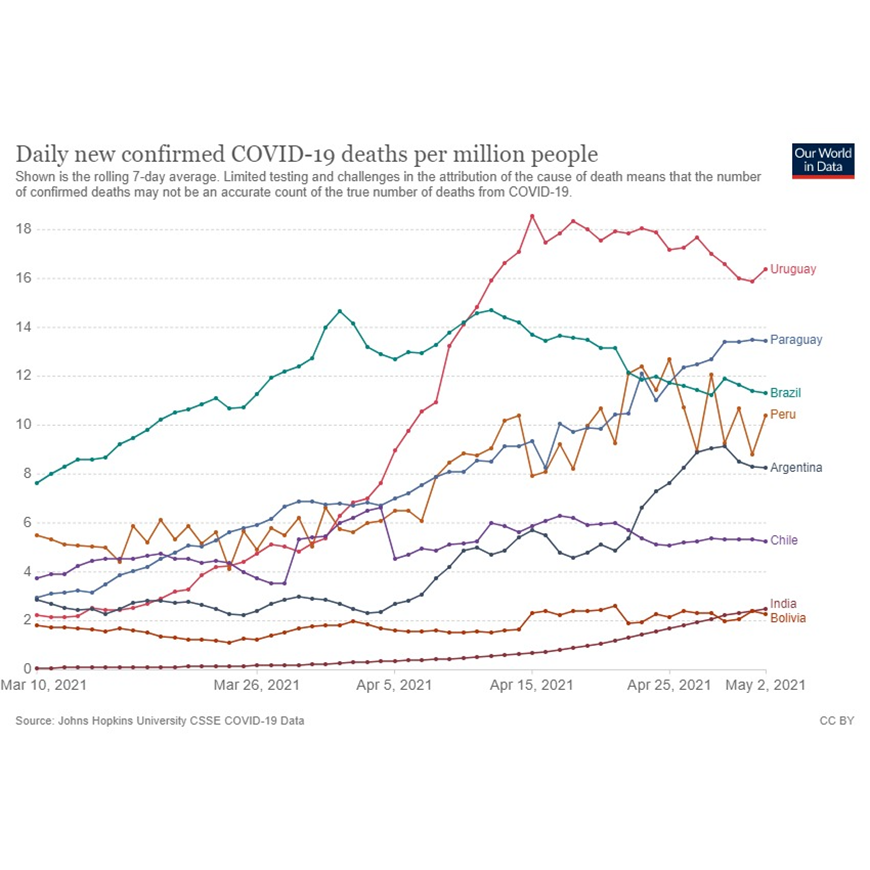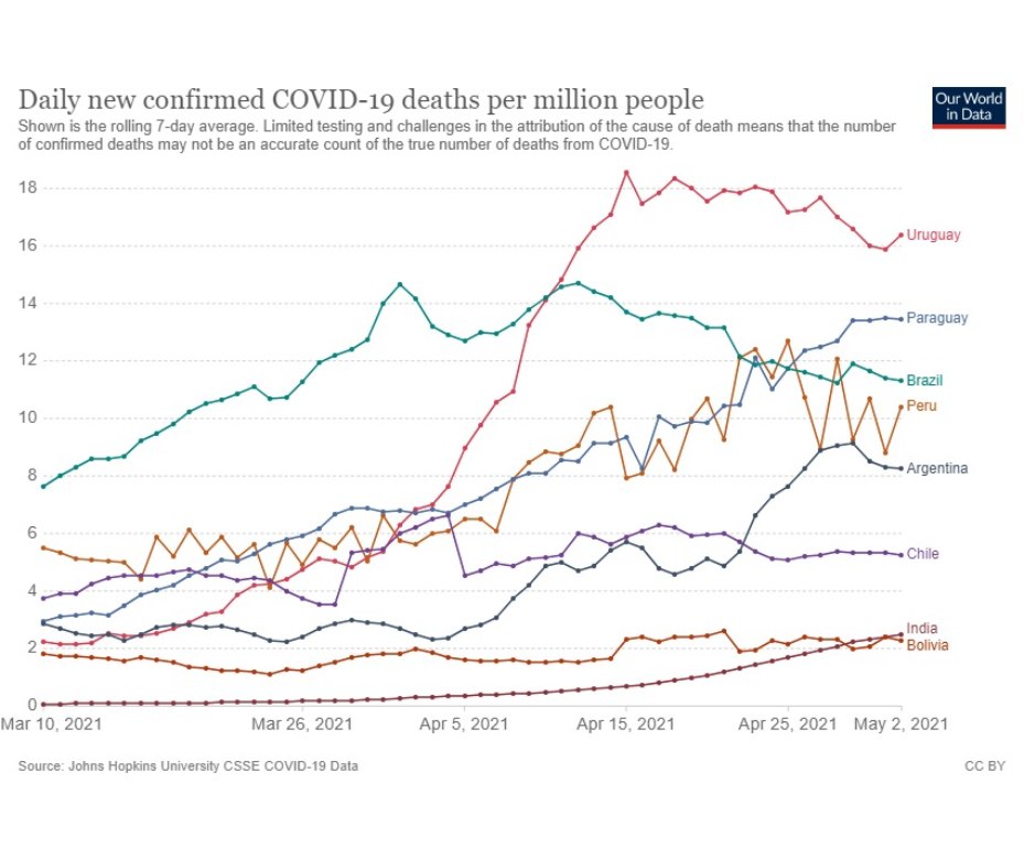 Según puede constatarse en la plataforma ourworldindata, a la fecha, Paraguay es el segundo país con más muertes diarias por millón de habitantes en la región. A escala global considerando este indicador la situación en la región es peor a la reportada en India, país que ha tomado notoriedad internacional debido a su gran población y alta mortalidad.