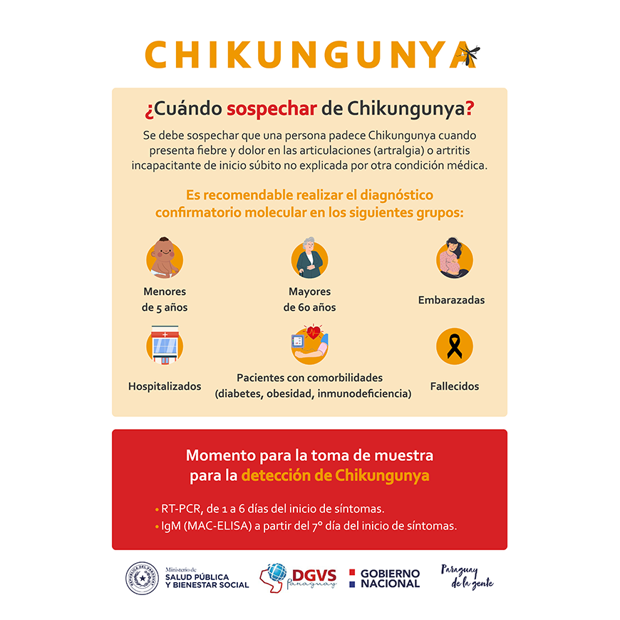 Ante el incremento de casos de chikungunya, principalmente en Asunción y Central, desde la Dirección General de Vigilancia de la Salud se emiten recomendaciones para la atención oportuna y eficaz de pacientes con signos y síntomas vinculados al virus CHIKV.