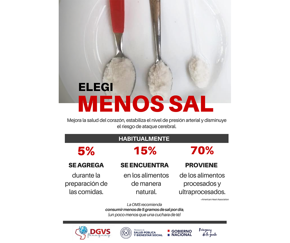 La campaña de concienciación sobre el consumo de sal este año se enfoca en la sal oculta, es la que no vemos y algunas veces no detectamos en los alimentos dulces; se agrega durante la cocción y elaboración de productos alimentarios como los panificados, cereales para el desayuno, productos de confitería y repostería, salsas, snacks, entre otros. Igualmente, cuando se come en un restaurante, es imposible saber cuánta sal hay en la comida porque viene lista.