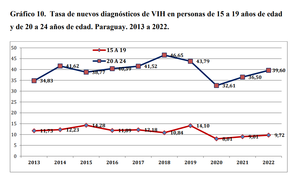 La tasa de nuevos diagnósticos de VIH presenta una tendencia creciente en personas de 15 a 19 años y 20 a 24 años, desde el 2013 hasta el 2019, con un incremento de 11.73 a 14.10 y de 34.83 a 43.79 por cada 100.000 habitantes respectivamente.