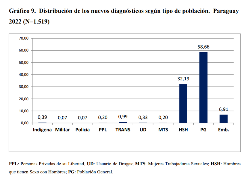 Un alto porcentaje de los nuevos diagnósticos registrados en el país se detectó en población general (58,66%), también en hombres que tienen sexo con hombres (32,19%) y en embarazadas (6,91%). En cambio, se evidencia menor proporción de nuevos diagnósticos en personas privadas de libertad (0,20%), en mujeres trabajadoras sexuales (0,20%), en usuarios de drogas (0,33%) y en población trans (0,99%).