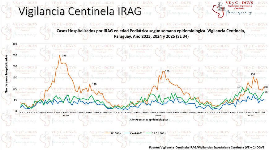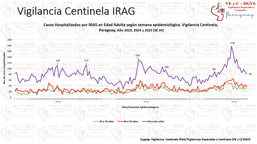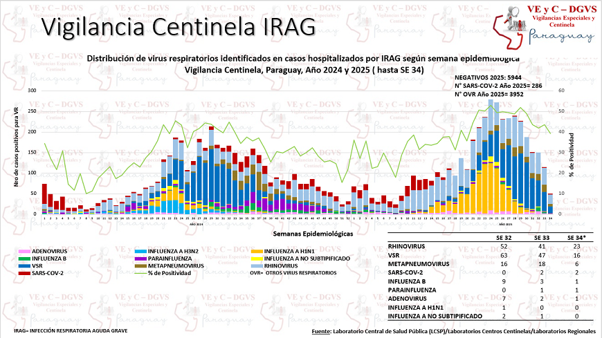 El reporte semanal señala que en la última semana (SE) 34, unas 400 personas fueron hospitalizadas por infecciones respiratorias agudas graves (IRAG), en los centros centinela, registrando un ligero incremento con respecto a la semana anterior. El 21% de los hospitalizados ingresó a la unidad de cuidados intensivos.