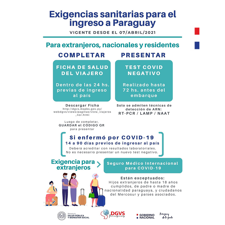 - Todo viajero que ingrese a territorio paraguayo debe presentar su resultado de test negativo de 72 horas y llenar la Ficha de Salud dentro de las 24 horas previas al ingreso al país.