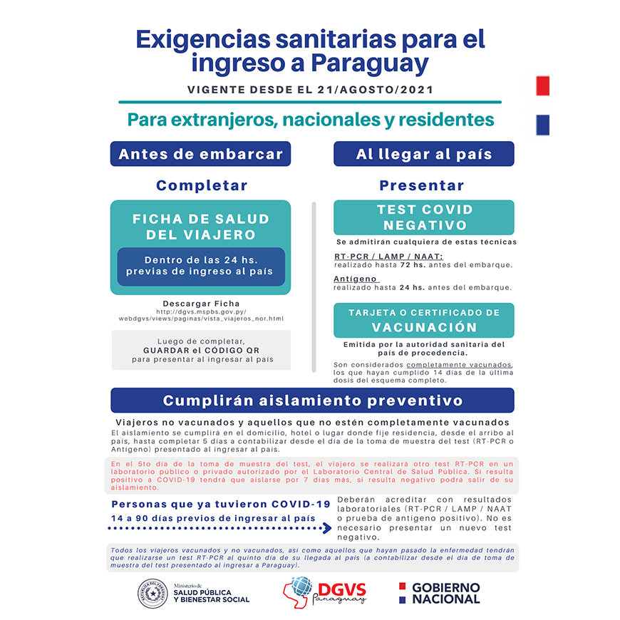 Desde este sábado 25 de agosto entran en vigencia las nuevas exigencias sanitarias para ingresar a Paraguay. El Protocolo establece que los viajeros nacionales, extranjeros y residentes extranjeros en el país tendrán que cumplir con los siguientes requerimientos: