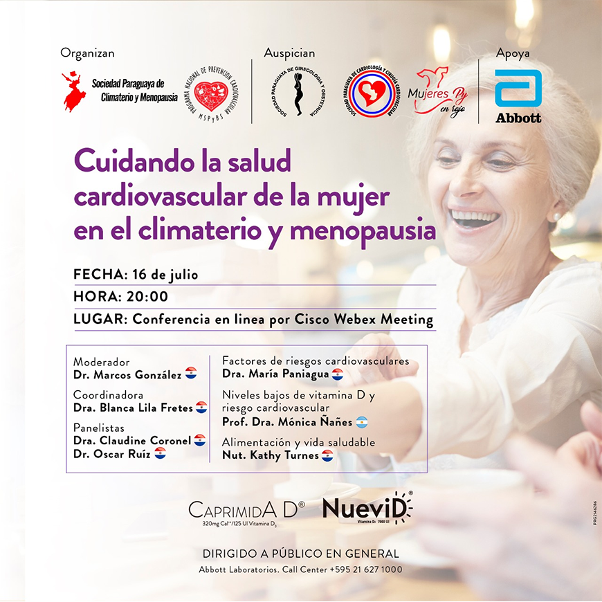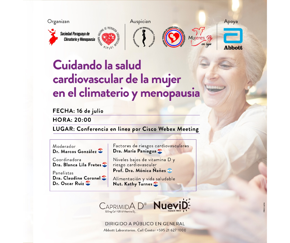 El Programa Nacional de Prevención Cardiovascular del Ministerio de Salud Pública en conjunto con la Sociedad Paraguaya de Climaterio y Menopausia invitan a la conferencia gratuita que se dictará este jueves 16 de julio, desde las 20:00, en línea por Cisco Webex Meeting. Interesados en participar de la conferencia en línea, deberán ingresar a través de https://bit.ly/climaterioymenopausia