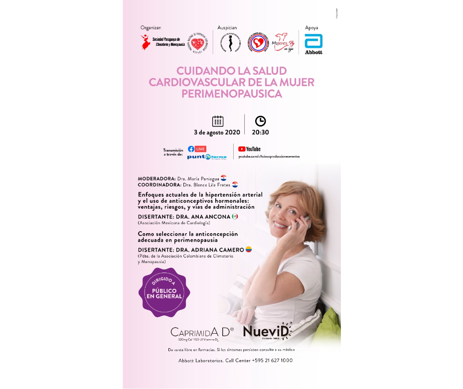El Programa Nacional de Prevención Cardiovascular del Ministerio de Salud Pública en conjunto con la Sociedad Paraguaya de Climaterio y Menopausia invitan a la conferencia gratuita que se brindará este lunes 03 de agosto, desde las 20:30. Será transmitido a través del Facebook Live y por canal de YouTube.