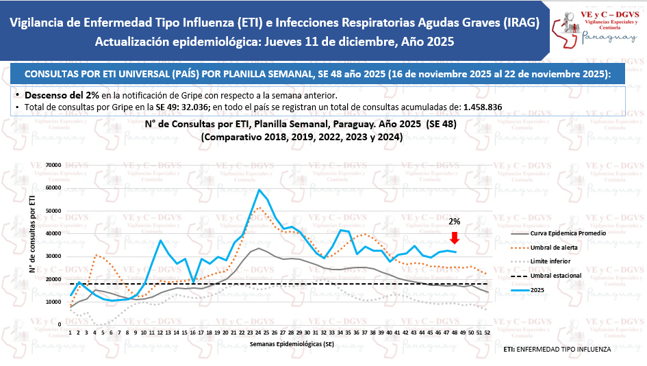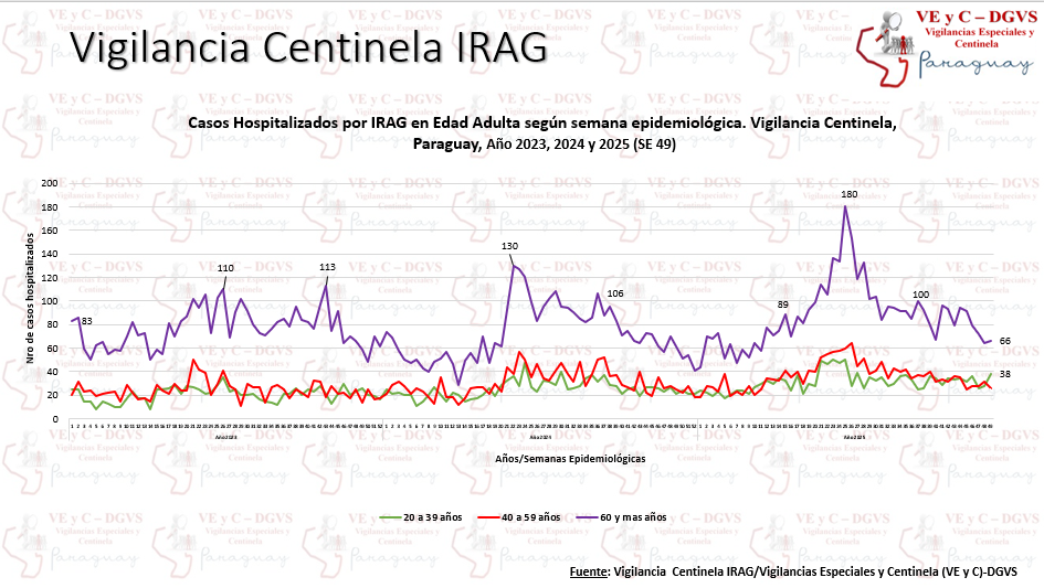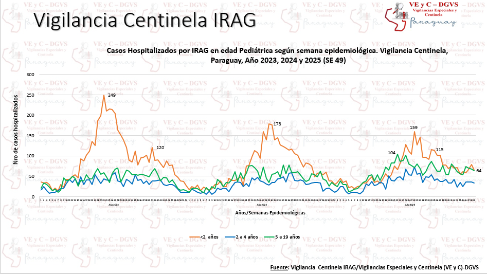 En cuanto a hospitalizaciones por infecciones respiratorias agudas graves (IRAG), durante la semana epidemiológica (SE) 49 se registraron 292 hospitalizaciones por IRAG en los centros centinela, lo que representa un descenso del 5% respecto a la semana previa. Del total de hospitalizados, el 19% requirió ingreso a la unidad de cuidados intensivos (UCI).