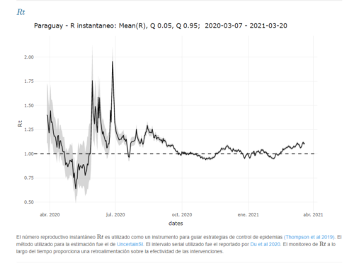 Paraguay registra un promedio de 1.928 nuevos infectados con el virus por día, con 2.478 casos nuevos diarios en el 95% del intervalo de confianza, cifra que representa un nuevo máximo desde el inicio de la epidemia. El cambio porcentual positivo es del 25% con respecto a la semana previa, siendo la sexta semana consecutiva de cambio porcentual positivo. Por lo tanto, se evidencia una tendencia sostenida de aumento en el número de casos nuevos.