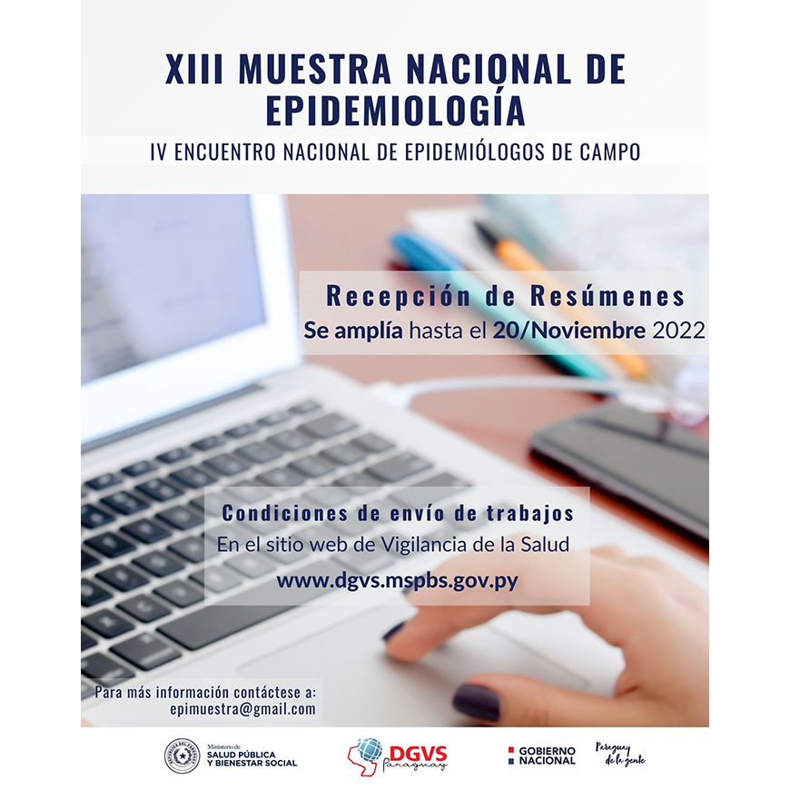 La Dirección General de Vigilancia de la Salud, a través de la Dirección de Docencia e Investigación informa, que se extiende el período de recepción de resúmenes de temas libres y trabajos de investigación que serán presentados durante la «XIII Muestra Nacional de Epidemiología y IV Encuentro Nacional de Epidemiólogos de Campo” que se llevará a cabo el próximo mes, del 13 al 15 de diciembre, en Ciudad del Este.