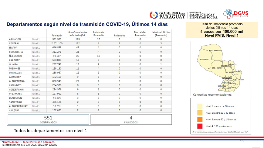 A nivel país se observa una baja transmisión comunitaria, Nivel 1, con una tasa de incidencia de 4 casos por 100.000 habitantes.