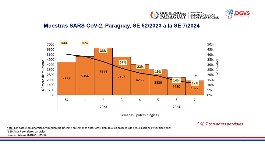 En lo que respecta a la positividad de contagios se registra una tasa de 12%, evidenciando un descenso con relación a semanas anteriores. Esto coincide con la disminución de muestras procesadas. En las últimas cinco semanas se reporta descenso de casos.
