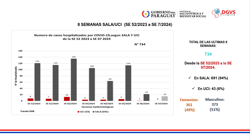 Con respecto a los datos de hospitalizados, en las últimas tres semanas se contabilizaron 158 hospitalizados por COVID-19, de los cuales, 151 se hallan en sala y 7 ingresaron a la unidad de cuidados intensivos.