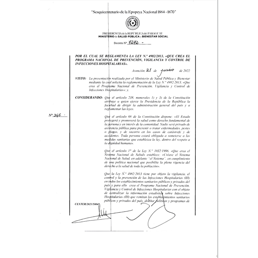 Por Decreto N° 7272 se reglamenta la Ley N° 4982/2013 “Que crea el Programa Nacional de Prevención, Vigilancia y Control de Infecciones Hospitalarias”. La rúbrica del documento se llevó a cabo el 21 de junio de 2022. La autoridad de aplicación de esta Ley es el Ministerio de Salud Pública y Bienestar Social, a través de la Dirección General de Vigilancia de la Salud, por medio de su Programa Nacional de Vigilancia y Control de Infecciones Hospitalarias.