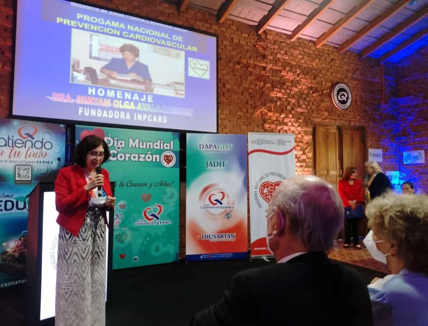 En la oportunidad, se realizó un acto de gratitud y reconocimiento a la Dra. Miriam Ayala, primera mujer cardióloga del Paraguay, líder en la prevención cardiovascular, fundadora del Programa de Prevención Cardiovascular. La profesional cuenta con una larga trayectoria caracterizada por la excelencia en su profesión y dedicación a favor de la salud pública del país.