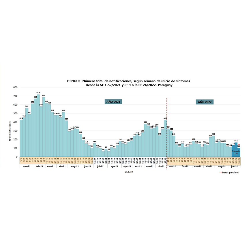 En las últimas tres semanas, el promedio de notificaciones de cuadros sospechosos de dengue es de 133, detalla el reporte semanal de la Vigilancia de Arbovirosis, de la Dirección de Vigilancia de la Salud.