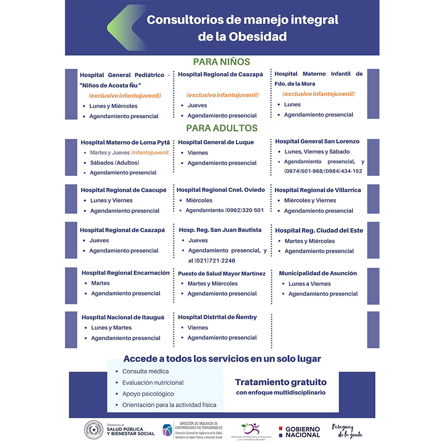 Hasta el momento, el Ministerio de Salud Pública dispone de 17 consultorios para el manejo integral de la obesidad instalados en las diferentes regiones del país.