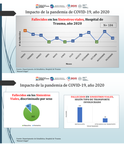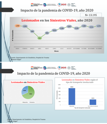De acuerdo a datos de la Policía Nacional, a nivel país se contabilizaron en ese año, 3.513 lesionados y 814 decesos relacionados a siniestros viales. El pico más bajo de lesionados se alcanzó en el mes de abril, en coincidencia con la cuarentena total, con 134 casos. El pico más alto se observó en el mes de diciembre, con 366 heridos. El choque fue el principal mecanismo de ocurrencia de estos percances.