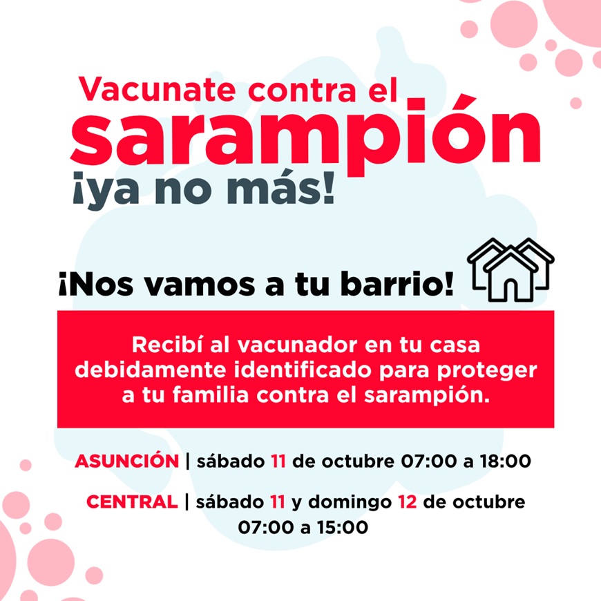 La jornada, parte de la campaña “Vacúnate contra el sarampión ¡Ya no más!, se realizará este sábado 11 de octubre en los barrios de Asunción: Tacumbú, San Pablo, Santa Rosa, Virgen de Fátima y San Blas, y el sábado 11 y domingo 12 de octubre en cinco distritos de Central.