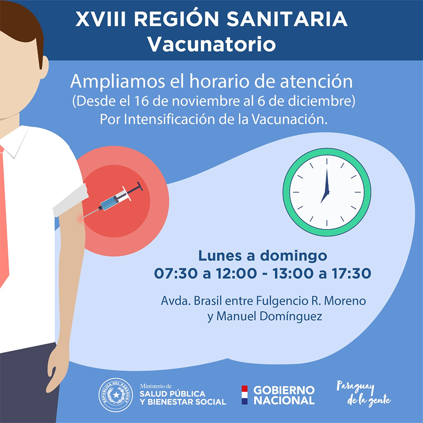 La Décimo Octava Región Sanitaria – Capital informa que a partir del lunes 16 de noviembre extiende el horario de atención del vacunatorio, en el marco de la intensificación de las actividades de vacunación.