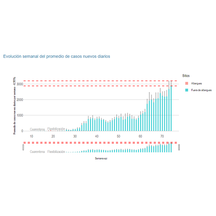 De acuerdo al Reporte Semanal de COVID-19, la curva epidémica a nivel país señala un promedio diario de 2875 nuevos infectados, con un valor probable de 3198 en el 95% del intervalo de confianza, cuya cifra no es significativamente superior a la semana previa. Se reporta un cambio porcentual positivo de 13.8% con respecto a un promedio móvil de las semanas previas, que indica una tendencia creciente de la curva epidémica.