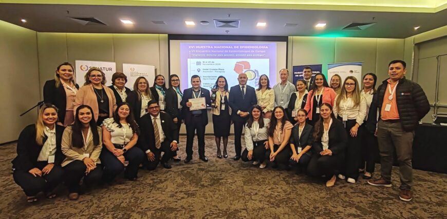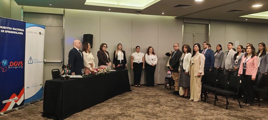 En esta edición de la Muestra Nacional de Epidemiología se llevó a cabo el acto de graduación de 34 profesionales de la salud de los diferentes niveles del Programa de Entrenamiento de Epidemiologia de Campo: 9 de la segunda cohorte del nivel intermedio (Capital, Alto Paraná, Guairá, Concepción e Itapúa), 9 de la decimoséptima cohorte del nivel Básico o Frontline (Caaguazú) y 16 del nivel Básico con enfoque Una Salud (Ñeembucú).