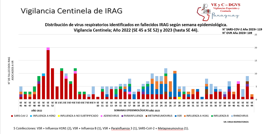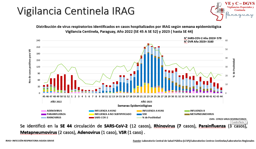 En lo que respecta a hospitalizados por infecciones respiratorias agudas graves (IRAG), en los centros centinela se verificó un leve descenso de nuevos internados. En esta última semana se contabilizaron 258 internaciones por IRAG, 54 menos que la semana anterior, de los cuales, el 57% corresponde a la edad pediátrica; siendo el 48% niños menores de 2 años que es el grupo más afectado, y el 43% de la edad adulta. Pese a este descenso, el número de hospitalizados se encuentra por encima de lo registrado el año anterior en esta misma época.