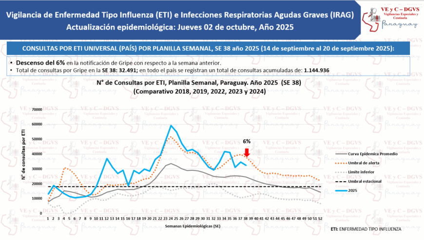 Datos actualizados señalan que en la última semana se han notificado 32.491 consultas por cuadros respiratorios, 6% menos con relación a lo reportado la semana anterior, reflejando una curva de tendencia que se mantiene por debajo del umbral de alerta.