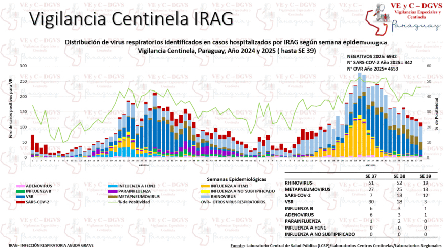 En lo que va del año, suman 315 los fallecidos confirmados por virus respiratorios, principalmente por Influenza A H1N1, Rhinovirus y SARS-CoV-2. En la última semana (SE) 39 se identificaron 4 fallecidos asociados a virus respiratorios: Metapneumovirus (1), Rhinovirus (1), Virus Sincitial (1), SARS-CoV2 (1).