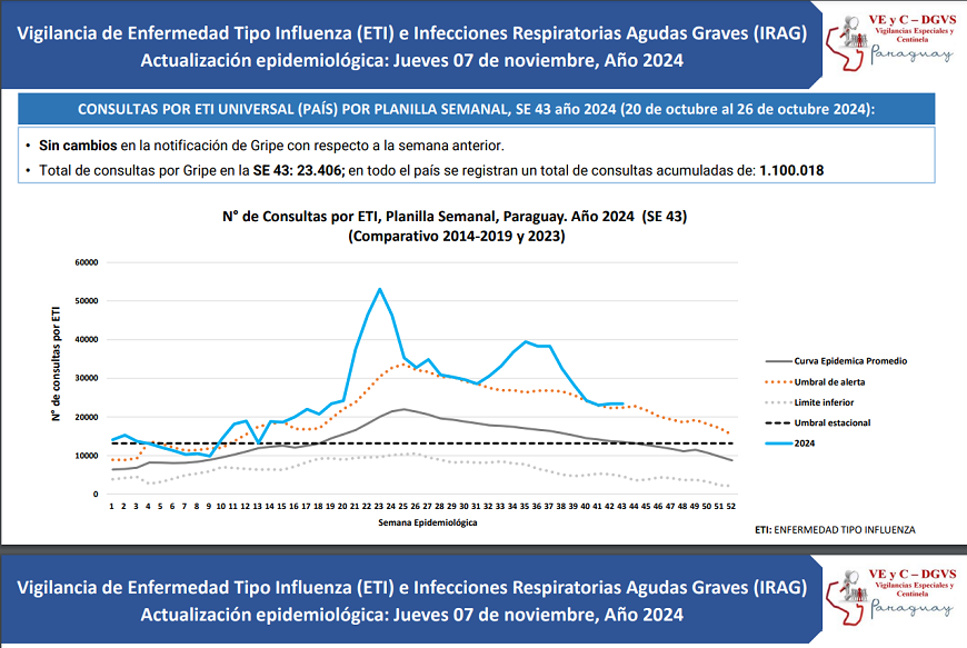 El reporte actualizado de Vigilancia Centinela destaca que la demanda de consultas por cuadros respiratorios se muestra muy similar a la semana anterior. Al cierre de la semana (SE) 43 se contabilizaron 23.406 consultas por gripe a nivel país, cifra que aún mantiene la curva de tendencia por encima del umbral de alerta.
