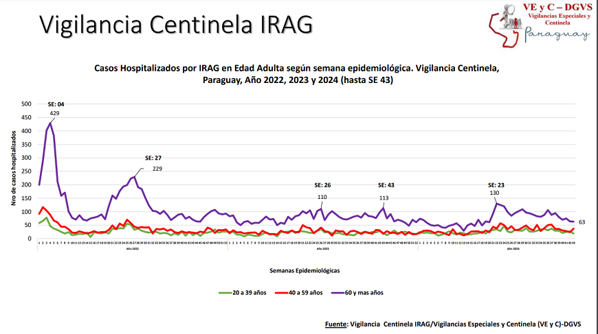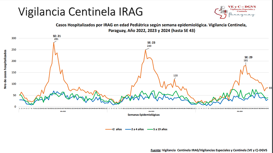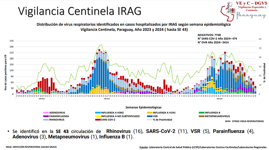 En este periodo se han reportado 273 hospitalizados por infecciones respiratorias agudas graves (IRAG) en los centros centinela, evidenciando un ligero aumento del 4,6%, con relación a la semana anterior. En la mayoría de los casos asociado a Rhinovirus y SARS-CoV2. El 56% de las internaciones corresponde a la edad pediátrica, siendo el 54% menores de 2 años y 44% a la edad adulta, de los cuales el 53% son mayores de 60 años.