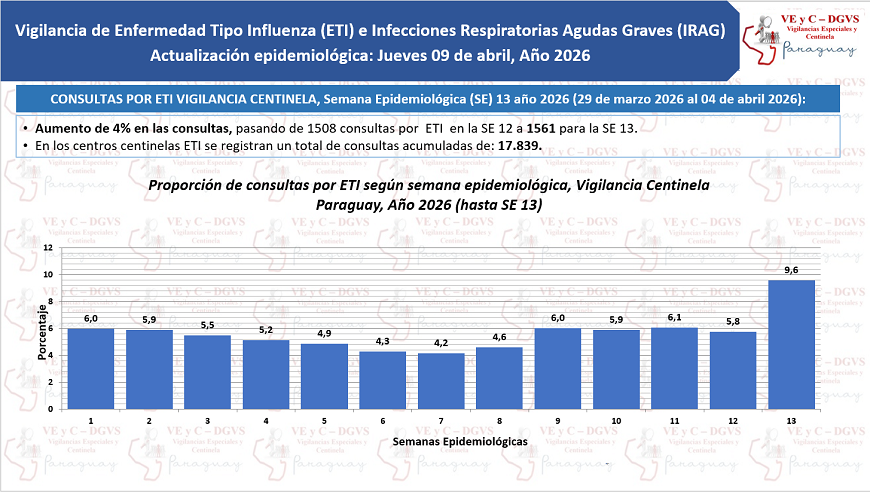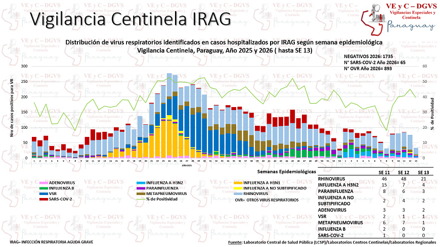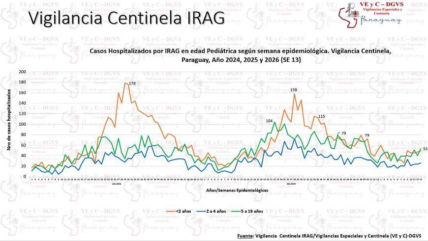 En la última semana, (SE) 13 se contabilizaron 226 hospitalizados por infecciones respiratorias agudas graves (IRAG) en los Centros Centinela, registrando un descenso del 8%. En este periodo, el 10% de los internados requirió cuidados intensivos.