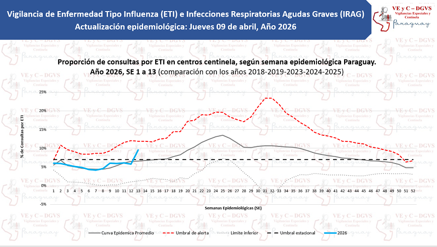 La semana cerró con 1.561 consultas por enfermedad tipo influenza (ETI) en los Centros Centinela, reflejando un incremento del 4% con relación a la semana anterior, pasando de 1508 a 1561 consultas respiratorias. En lo que respecta a la Vigilancia Universal, se han notificado un total de 28.948 consultas médicas por cuadros respiratorios a nivel país. La curva de tendencia se mantiene por encima del umbral de alerta, lo que refleja una tendencia sostenida en la circulación de cuadros respiratorios.
