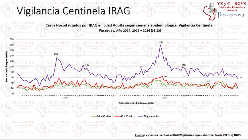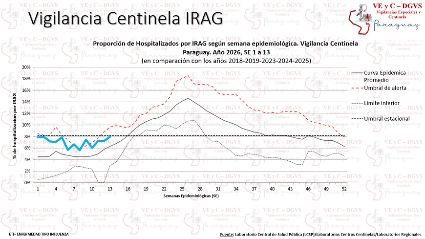 En la última semana, (SE) 13 se contabilizaron 226 hospitalizados por infecciones respiratorias agudas graves (IRAG) en los Centros Centinela, registrando un descenso del 8%. En este periodo, el 10% de los internados requirió cuidados intensivos.