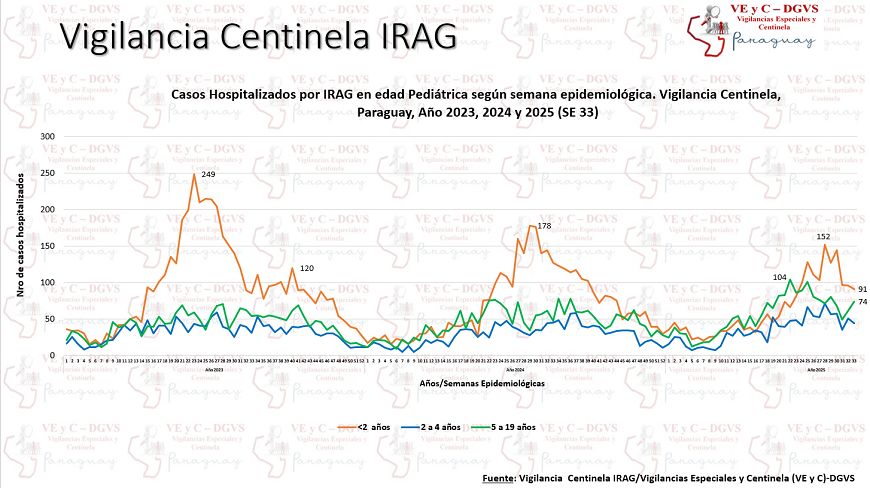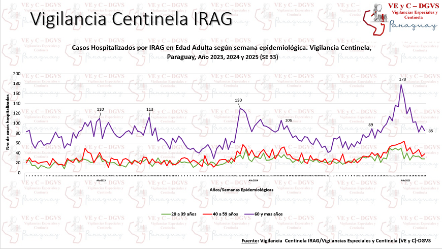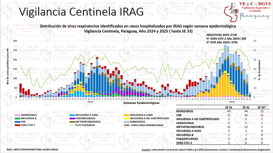 En la semana (SE) 33, unas 360 personas fueron hospitalizadas por infecciones respiratorias agudas graves (IRAG), en los centros centinela, registrando un descenso del 1%, con respecto a la semana anterior. El 21% de los hospitalizados ingresó a la unidad de cuidados intensivos.