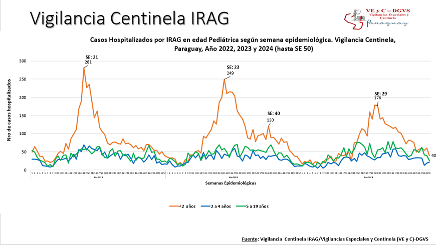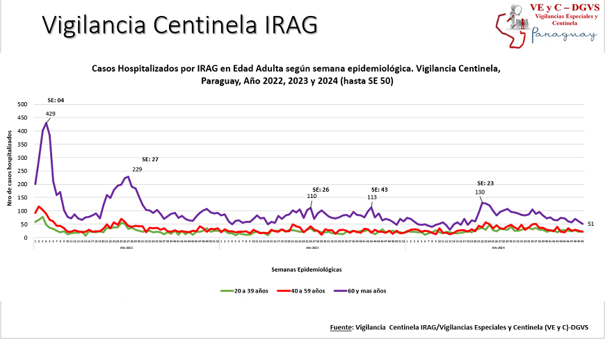 Esta disminución se observa igualmente en la cifra de hospitalizaciones. En esta última semana se contabilizaron 185 hospitalizados por infecciones respiratorias agudas graves (IRAG) en los centros centinela, evidenciando un ligero descenso de 1%, con relación a la semana anterior. En la mayoría de los casos asociado a Rhinovirus y SARS-CoV2, registrando mayor predominancia en la franja adulta. El 52% de las internaciones corresponde a la edad adulta, de los cuales, el 53% son mayores de 60 años. Mientras que el 48% se registró en el grupo pediátrico, siendo el 46% menores de 2 años.