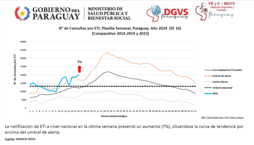 El reporte de Vigilancia Universal país señala que en la última semana (SE) 16, las consultas por enfermedad tipo influenza (ETI) han registrado un incremento del 7%, con relación a la semana anterior, pasando de 18.617 a 20.002, entre una semana y otra. La curva de tendencia actualmente se encuentra por encima del umbral de alerta.