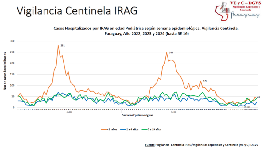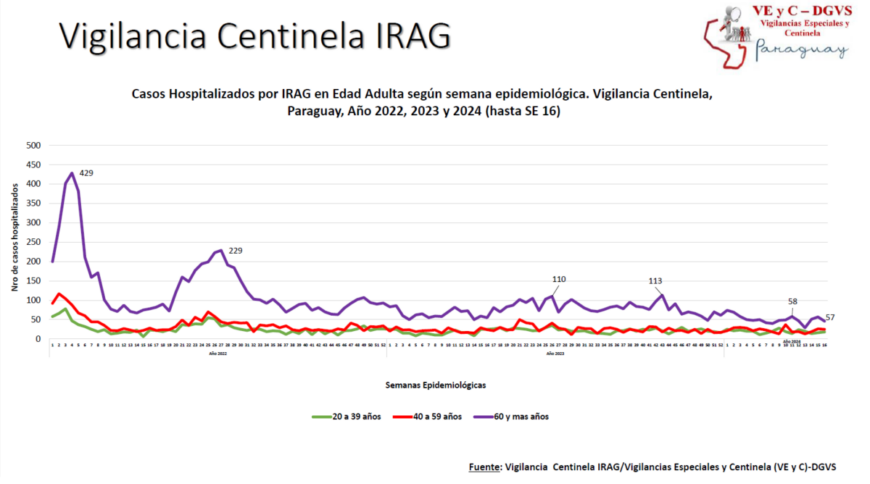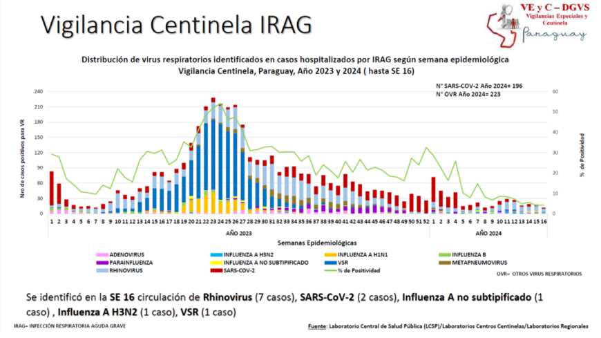 De acuerdo al reporte actualizado, en la última semana (SE) 16 se registraron 196 hospitalizados por infecciones respiratorias agudas graves (IRAG), 6 más que la semana anterior. En la mayoría de los casos está asociado a SARS-CoV2, seguido de influenza. El 55% de las internaciones corresponde a la edad pediátrica; siendo el 50% menores de 2 años, 45% corresponde a la edad adulta, y el 58% son mayores de 60 años.