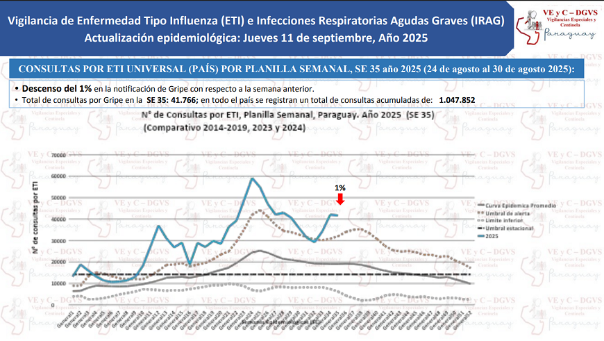Al cierre de la semana se han notificado 41.766 consultas por cuadros respiratorios a nivel país, registrando una leve disminución de 1%, con relación a la semana anterior. La curva de tendencia se mantiene por encima del umbral de alerta.