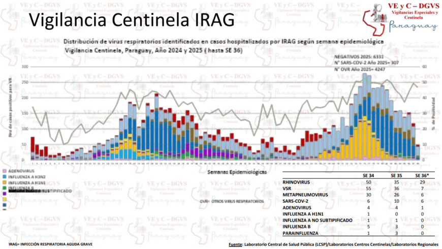 En lo que va del año, suman 298 los fallecidos confirmados por virus respiratorios, principalmente por Influenza A H1N1, Rhinovirus y SARS-CoV-2. En la última semana (SE) 36 se identificaron 5 fallecidos asociados a virus respiratorios: Rhinovirus (2), Virus Sincitial (1), Influenza A no Subtipificada (1) e Influenza B (1).