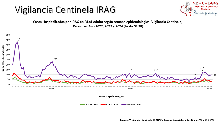 Al cierre de la semana (SE) 28 se han reportado 381 hospitalizados por infecciones respiratorias agudas graves (IRAG) en los centros centinela. En la mayoría de los casos asociado a VSR, influenza y SARS-CoV2. El 57% de las internaciones corresponde a la edad pediátrica; siendo el 67% menores de 2 años y 43% a la edad adulta, de los cuales el 60% son mayores de 60 años.